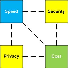 • There is a trade-off between speed, security (data integrity, data confidentiality), and privacy (anonymity)