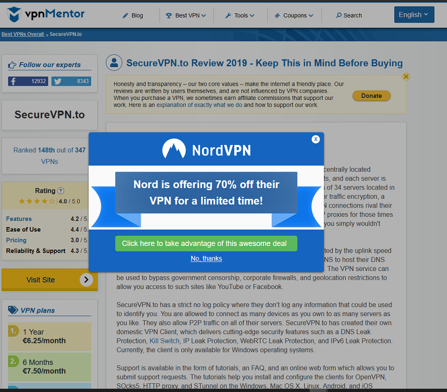 Last but not least, just in case I didn't get the message driven home... or perhaps in case I can't read... oh look, when I attempt to move away from the glowing-but-not-so-glowing review of SecureVPN.to, hint-hint... nudge-nudge... look over here at my superior friend NordVPN, what happens? A pop-up add for NordVPN. Wow. We see who is apparently subsidizing the electric bill at VPN Mentor. This is a great example of one of the tactics I refer to in The Great Global VPN Swindle.