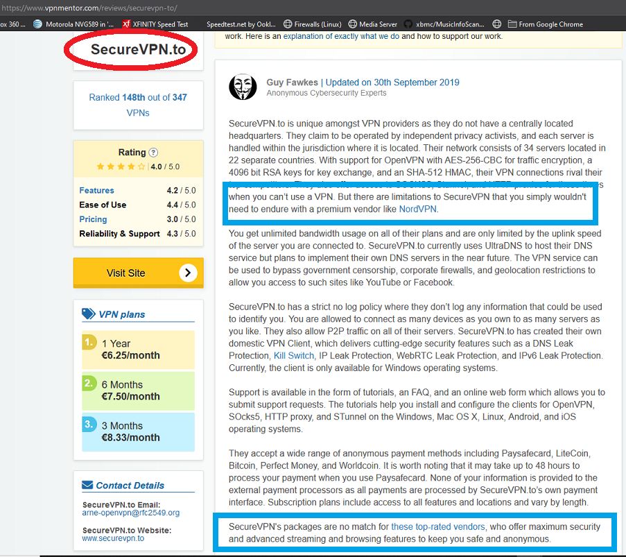 Another bone I have-to-pick with VPN Mentor is their subtle and consistent attempts to steer readers toward particular providers by inserting innuendos into reviews of non-favored service providers. To wit, here is a screenshot of their review of SecureVPN.to (not to be confused with SecureVPN.com). I have highlighted the comments I find questionable.
