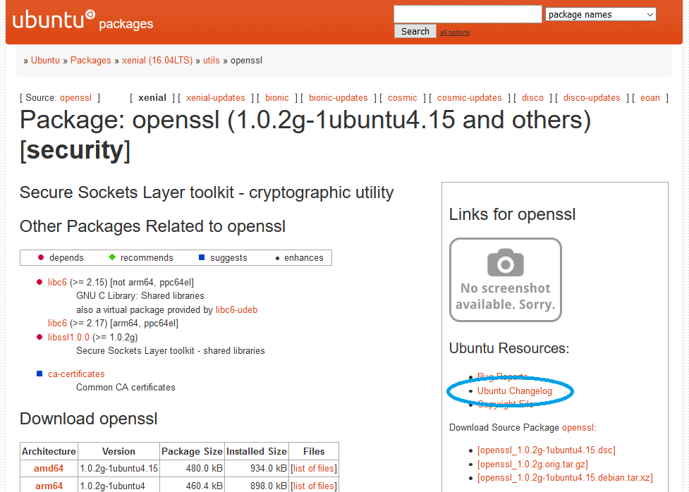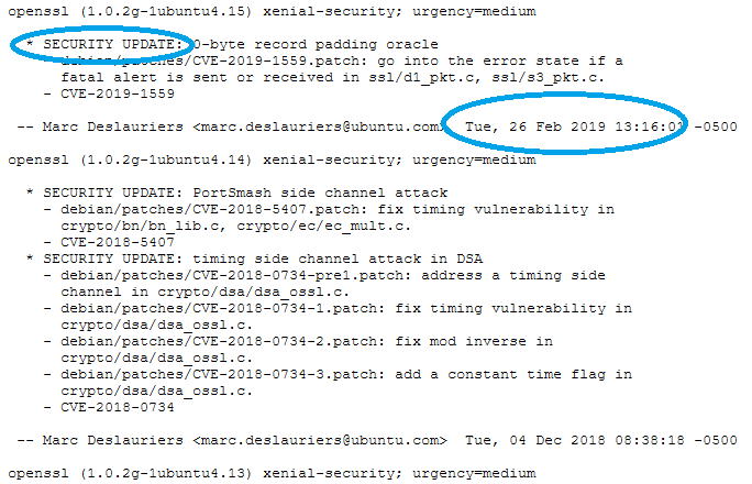 Notice they both indicate OpenSSL version 1.0.2g. The version number OpenSSL reports is over 3-1/2 years old! Alarming, to say the least since we are talking about networking security here! However, that's not the whole story. Is your shock and sense of alarm warranted? Let's find out. While this information is useful, when you have a program such as OpenSSL that is widely engrained into many applications, version numbers can become clear as mud. If you have concerns; if you don't trust the Ubuntu gurus at Canonical 100%, you need to dig deeper. Review the change log for the OpenSSL package and there you can find out what the heck is going on.