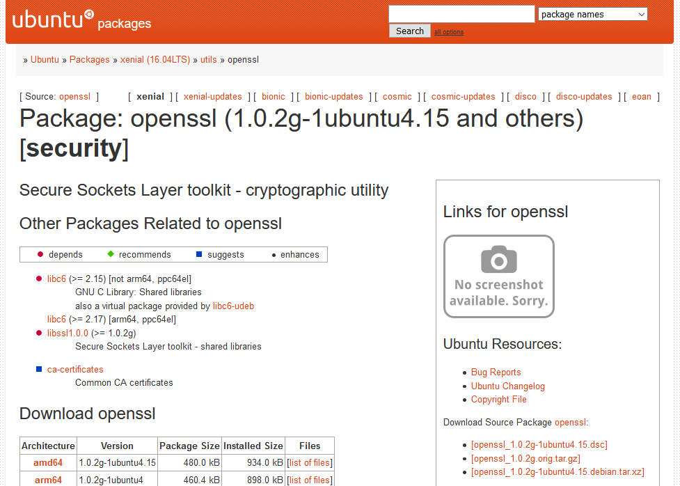 At this point you ought to be thinking to yourself this seems rather odd. The OpenSSL build in Ubuntu 16.04 appears to be labeled as version 1.0.2g. Meanwhile, if you review the OpenSSL version chart again, you'll note major version 1.0.2 is still supported ("Older version, still supported"), but the latest version is indicated as 1.0.2t with a date of 10 September 2019. Well, if we were using a version even close to 1.0.2t, it would be a heckuva lot more recent than 1.0.2g, which is what is reported by querying OpenSSL's version via the command line in terminal. And OpenSSL also reports its build date is from March 2016. Yet on the other hand, we just checked the change log for the Ubuntu package for OpenSSL and it was updated in February 2019. What gives? This data is all over the place. How do we know which version is truly installed right now, and which data source to believe?